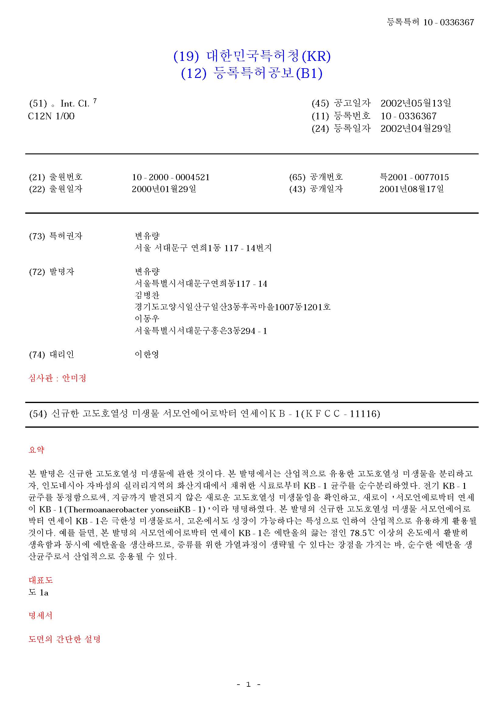 본 발명은 신규한 고도호열성 미생물에 관한 것이다. 본 발명에서는 산업적으로 유용한 고도호열성 미생물을 분리하고자, 인도네시아 자바섬의 실러리지역의 화산지대에서 채취한 시료로부터 KB-1 균주를 순수분리하였다. 전기 KB-1 균주를 동정함으로써, 지금까지 발견되지 않은 새로운 고도호열성 미생물임을 확인하고, 새로이 ‘서모언에로박터 연세이 KB-1(Thermoanaerobacter yonseiiKB-1)’이라 명명하였다. 본 발명의 신규한 고도호열성 미생물 서모언에어로박터 연세이 KB-1은 극한성 미생물로서, 고온에서도 성장이 가능하다는 특성으로 인하여 산업적으로 유용하게 활용될 것이다. 예를 들면, 본 발명의 서모언에어로박터 연세이 KB-1은 에탄올의 끓는 점인 78.5℃ 이상의 온도에서 활발히 생육함과 동시에 에탄올을 생산하므로, 증류를 위한 가열과정이 생략될 수 있다는 장점을 가지는 바, 순수한 에탄올 생산균주로서 산업적으로 응용될 수 있다.