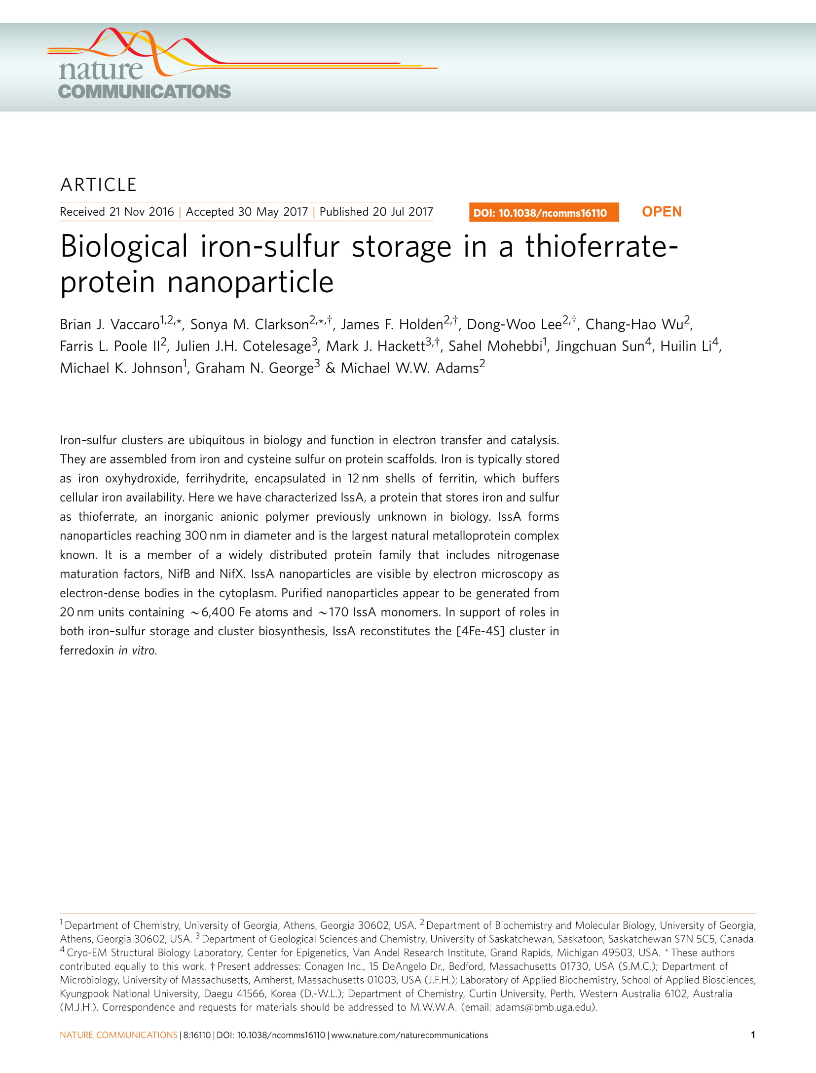 Iron–sulfur clusters are ubiquitous in biology and function in electron transfer and catalysis. They are assembled from iron and cysteine sulfur on protein scaffolds. Iron is typically stored as iron oxyhydroxide, ferrihydrite, encapsulated in 12 nm shells of ferritin, which buffers cellular iron availability. Here we have characterized IssA, a protein that stores iron and sulfur as thioferrate, an inorganic anionic polymer previously unknown in biology. IssA forms nanoparticles reaching 300 nm in diameter and is the largest natural metalloprotein complex known. It is a member of a widely distributed protein family that includes nitrogenase maturation factors, NifB and NifX. IssA nanoparticles are visible by electron microscopy as electron-dense bodies in the cytoplasm. Purified nanoparticles appear to be generated from 20 nm units containing B6,400 Fe atoms and B170 IssA monomers. In support of roles in both iron–sulfur storage and cluster biosynthesis, IssA reconstitutes the [4Fe-4S] cluster in ferredoxin in vitro.