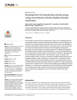 Poultry feathers consist mainly of the protein keratin, which is rich in β-pleated sheets and consequently resistant to proteolysis. Although many keratinases have been identified, the reasons for their substrate specificity towards β-keratin remain unclear due to difficulties in preparing a soluble feather keratin substrate for use in activity assays. In the present study, we overexpressed Gallus gallus chromosomes 2 and 27 β-keratin-encoding genes in Escherichia coli, purified denatured recombinant proteins by Ni2+ affinity chromatography, and refolded by stepwise dialysis to yield soluble keratins. To assess the keratinolytic activity, we compared the proteolytic activity of crude extracts from the feather- degrading bacterium Fervidobacterium islandicum AW-1 with proteinase K, trypsin, and papain using purified recombinant keratin and casein as substrates. All tested proteases showed strong proteolytic activities for casein, whereas only F. islandicum AW-1 crude extracts and proteinase K exhibited pronounced keratinolytic activity for the recombinant keratin. Moreover, LC-MS/MS analysis of keratin hydrolysates allowed us to predict the P1 sites of keratinolytic enzymes in the F. islandicum AW-1 extracts, thereby qualifying and quantifying the extent of keratinolysis. The soluble keratin-based assay has clear therapeutic and industrial potential for the development of a high-throughput screening system for proteases hydrolyzing disease-related protein aggregates, as well as mechanically resilient keratin-based polymers.