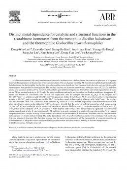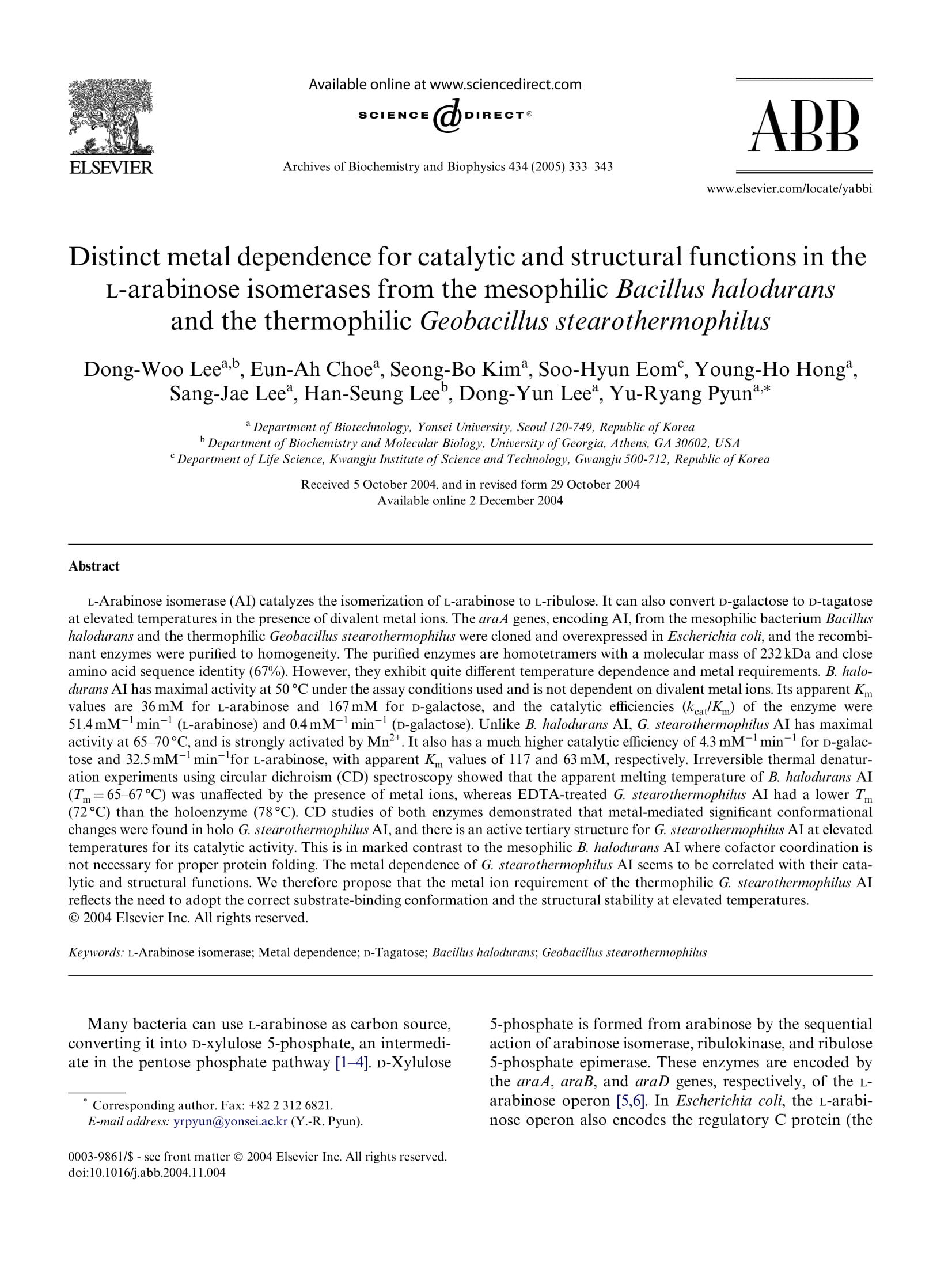 L-Arabinose isomerase (AI) catalyzes the isomerization of L-arabinose to L-ribulose. It can also convert D-galactose to D-tagatose at elevated temperatures in the presence of divalent metal ions. The araA genes, encoding AI, from the mesophilic bacterium Bacillus halodurans and the thermophilic Geobacillus stearothermophilus were cloned and overexpressed in Escherichia coli, and the recombinant enzymes were puriWed to homogeneity. The puriWed enzymes are homotetramers with a molecular mass of 232 kDa and close amino acid sequence identity (67%). However, they exhibit quite diVerent temperature dependence and metal requirements. B. halodurans AI has maximal activity at 50 °C under the assay conditions used and is not dependent on divalent metal ions. Its apparent Km values are 36mM for L-arabinose and 167mM for D-galactose, and the catalytic eYciencies (kcat/Km) of the enzyme were 51.4mM¡1 min¡1 (L-arabinose) and 0.4mM¡1 min¡1 (D-galactose). Unlike B. halodurans AI, G. stearothermophilus AI has maximal activity at 65–70 °C, and is strongly activated by Mn2+. It also has a much higher catalytic eYciency of 4.3mM¡1 min¡1 for D-galactose and 32.5mM¡1 min¡1for L-arabinose, with apparent Km values of 117 and 63 mM, respectively. Irreversible thermal denaturation experiments using circular dichroism (CD) spectroscopy showed that the apparent melting temperature of B. halodurans AI (TmD65–67 °C) was unaVected by the presence of metal ions, whereas EDTA-treated G. stearothermophilus AI had a lower Tm (72 °C) than the holoenzyme (78 °C). CD studies of both enzymes demonstrated that metal-mediated signiWcant conformational changes were found in holo G. stearothermophilus AI, and there is an active tertiary structure for G. stearothermophilus AI at elevated temperatures for its catalytic activity. This is in marked contrast to the mesophilic B. halodurans AI where cofactor coordination is not necessary for proper protein folding. The metal dependence of G. stearothermophilus AI seems to be correlated with their catalytic and structural functions. We therefore propose that the metal ion requirement of the thermophilic G. stearothermophilus AI reflects the need to adopt the correct substrate-binding conformation and the structural stability at elevated temperatures.