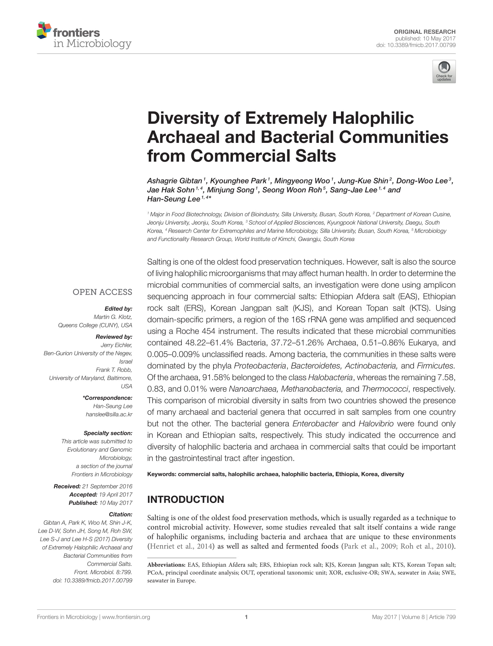 Salting is one of the oldest food preservation techniques. However, salt is also the source of living halophilic microorganisms thatmay affect human health. In order to determine the microbial communities of commercial salts, an investigation were done using amplicon sequencing approach in four commercial salts: Ethiopian Afdera salt (EAS), Ethiopian rock salt (ERS), Korean Jangpan salt (KJS), and Korean Topan salt (KTS). Using domain-specific primers, a region of the 16S rRNA gene was amplified and sequenced using a Roche 454 instrument. The results indicated that these microbial communities contained 48.22–61.4% Bacteria, 37.72–51.26% Archaea, 0.51–0.86% Eukarya, and 0.005–0.009% unclassified reads. Among bacteria, the communities in these salts were dominated by the phyla Proteobacteria , Bacteroidetes, Actinobacteria, and Firmicutes. Of the archaea, 91.58%belonged to the class Halobacteria , whereas the remaining 7.58, 0.83, and 0.01% were Nanoarchaea, Methanobacteria, and Thermococci , respectively. This comparison of microbial diversity in salts from two countries showed the presence of many archaeal and bacterial genera that occurred in salt samples from one country but not the other. The bacterial genera Enterobacter and Halovibrio were found only in Korean and Ethiopian salts, respectively. This study indicated the occurrence and diversity of halophilic bacteria and archaea in commercial salts that could be important in the gastrointestinal tract after ingestion.