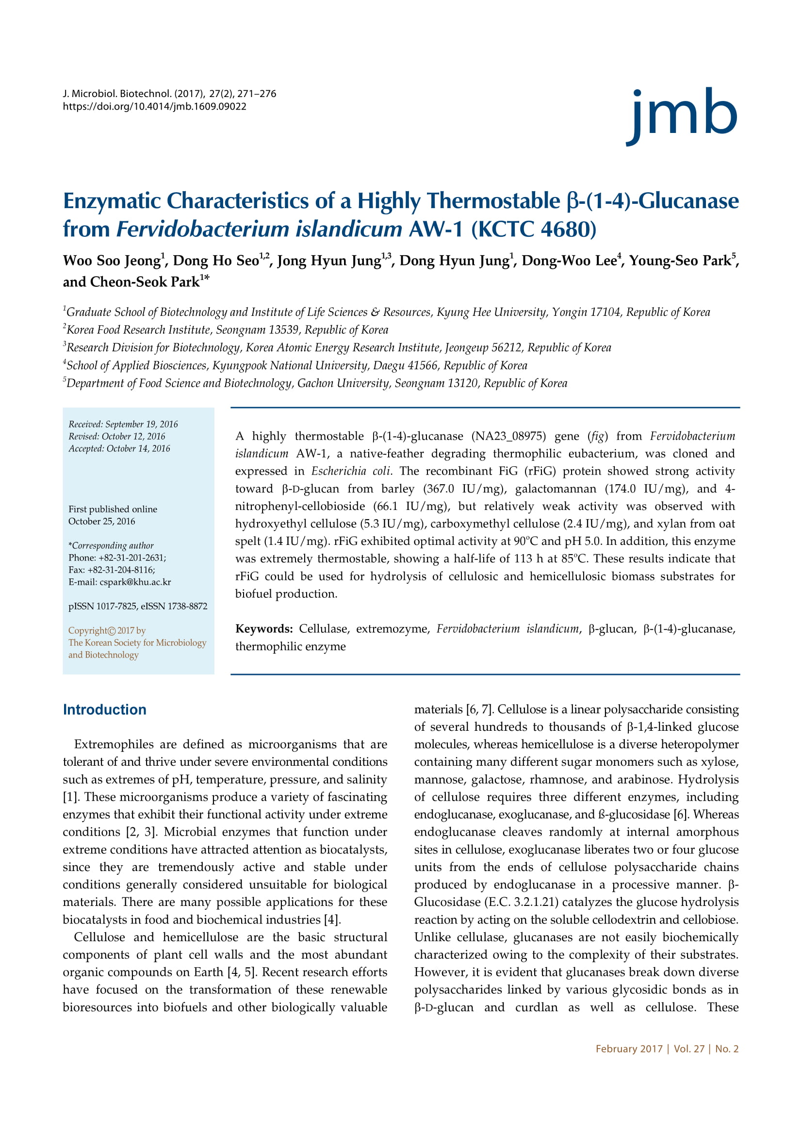 Enzymatic Characteristics of a Highly Thermostable β-(1-4)-Glucanase from Fervidobacterium islandicum AW-1 (KCTC 4680)
