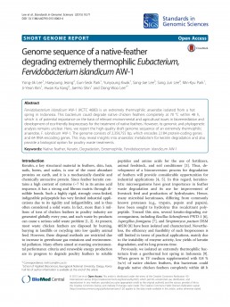 Fervidobacterium islandicum AW-1 (KCTC 4680) is an extremely thermophilic anaerobe isolated from a hot spring in Indonesia. This bacterium could degrade native chicken feathers completely at 70 °C within 48 h, which is of potential importance on the basis of relevant environmental and agricultural issues in bioremediation and development of eco-friendly bioprocesses for the treatment of native feathers. However, its genomic and phylogenetic analysis remains unclear. Here, we report the high-quality draft genome sequence of an extremely thermophilic anaerobe, F. islandicum AW-1. The genome consists of 2,359,755 bp, which encodes 2,184 protein-coding genes and 64 RNA-encoding genes. This may reveal insights into anaerobic metabolism for keratin degradation and also provide a biological option for poultry waste treatments.