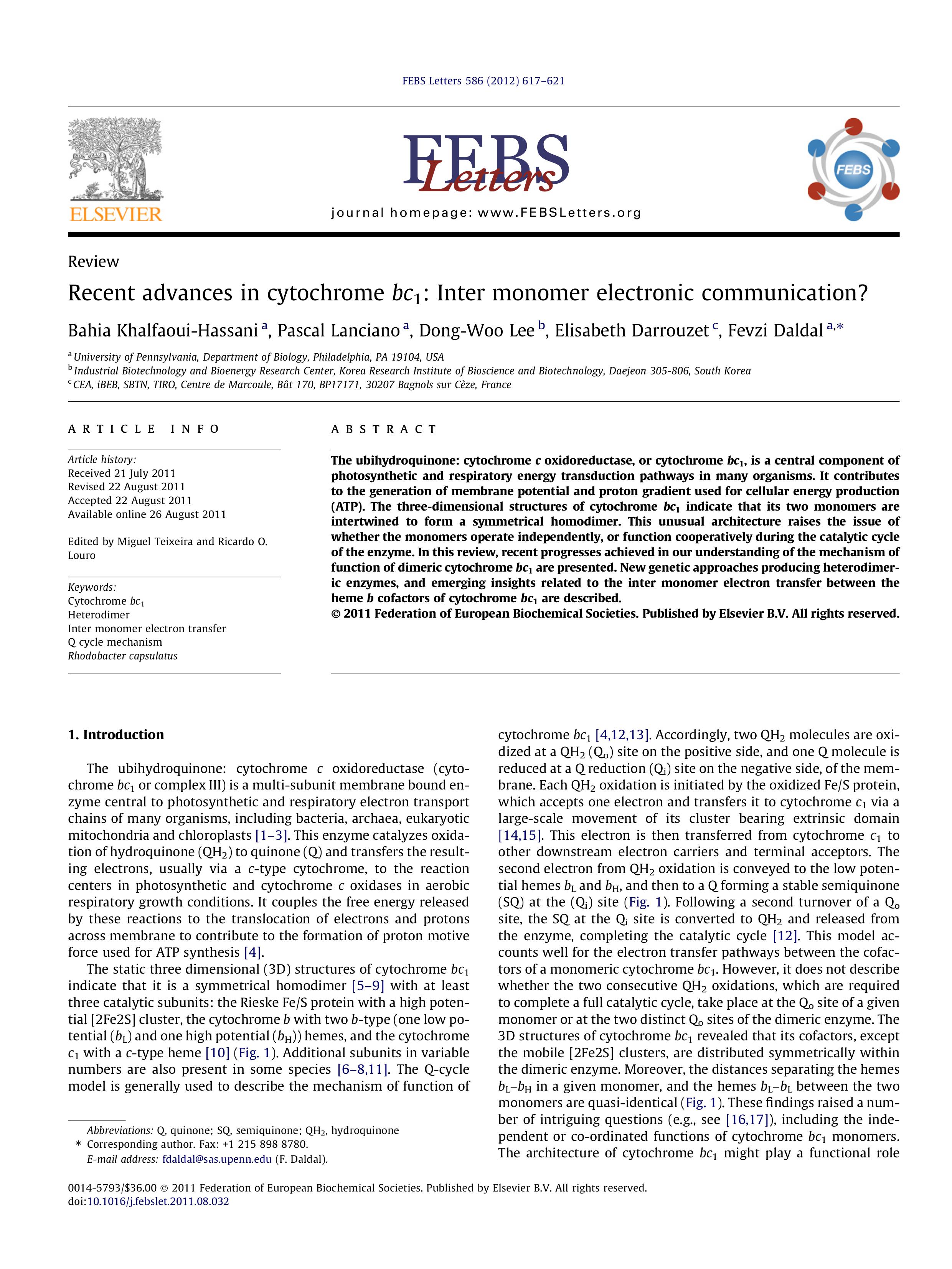 The ubihydroquinone: cytochrome c oxidoreductase, or cytochrome bc(1), is a central component of photosynthetic and respiratory energy transduction pathways in many organisms. It contributes to the generation of membrane potential and proton gradient used for cellular energy production (ATP). The three-dimensional structures of cytochrome bc(1) indicate that its two monomers are intertwined to form a symmetrical homodimer. This unusual architecture raises the issue of whether the monomers operate independently, or function cooperatively during the catalytic cycle of the enzyme. In this review, recent progresses achieved in our understanding of the mechanism of function of dimeric cytochrome bc(1) are presented. New genetic approaches producing heterodimeric enzymes, and emerging insights related to the inter monomer electron transfer between the heme b cofactors of cytochrome bc(1) are described