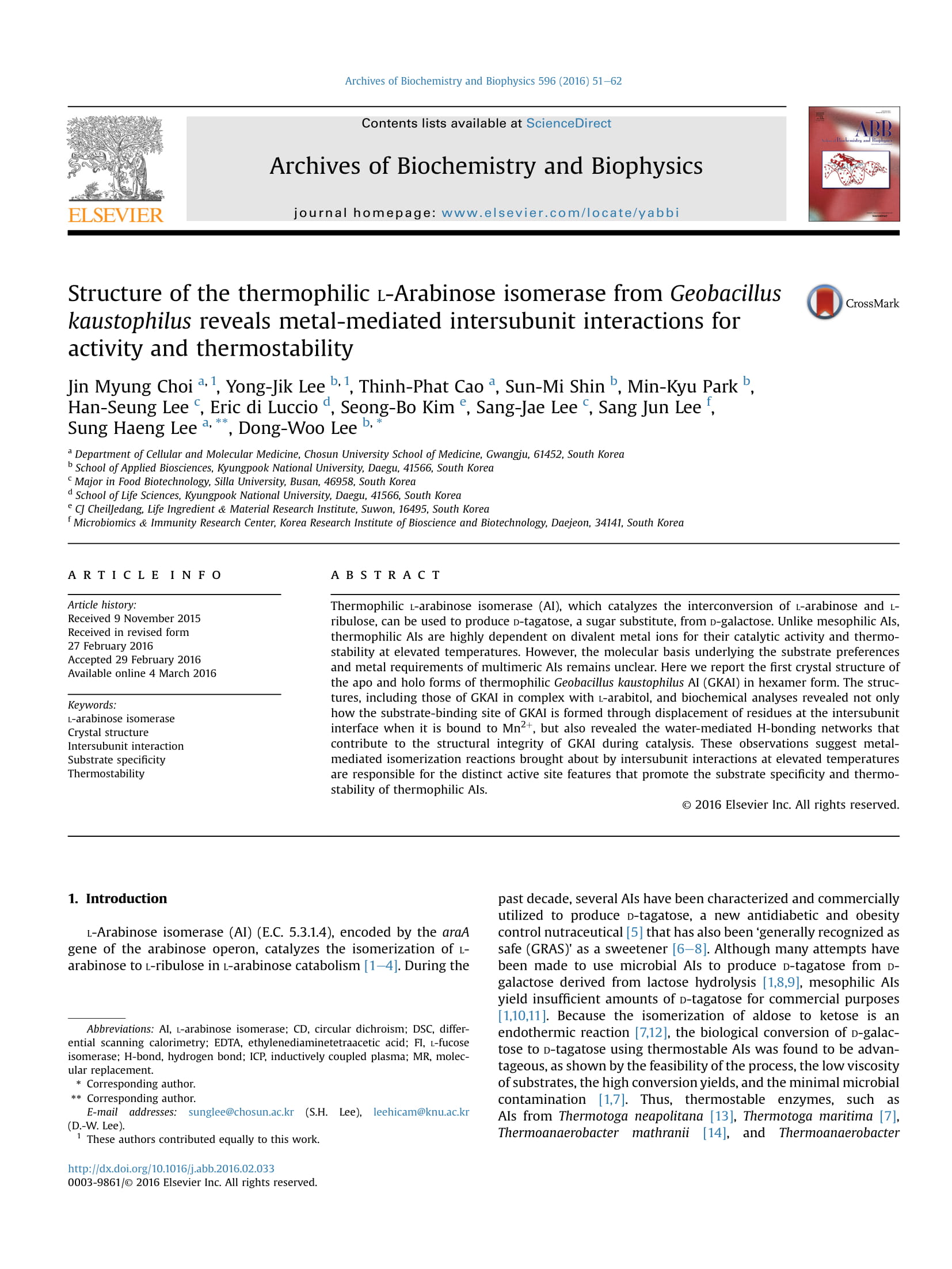 Thermophilic L-arabinose isomerase (AI), which catalyzes the interconversion of L-arabinose and L-ribulose, can be used to produce D-tagatose, a sugar substitute, from D-galactose. Unlike mesophilic AIs, thermophilic AIs are highly dependent on divalent metal ions for their catalytic activity and thermostability at elevated temperatures. However, the molecular basis underlying the substrate preferences and metal requirements of multimeric AIs remains unclear. Here we report the first crystal structure of the apo and holo forms of thermophilic Geobacillus kaustophilus AI (GKAI) in hexamer form. The structures, including those of GKAI in complex with L-arabitol, and biochemical analyses revealed not only how the substrate-binding site of GKAI is formed through displacement of residues at the intersubunit interface when it is bound to Mn2þ, but also revealed the water-mediated H-bonding networks that contribute to the structural integrity of GKAI during catalysis. These observations suggest metalmediated isomerization reactions brought about by intersubunit interactions at elevated temperatures are responsible for the distinct active site features that promote the substrate specificity and thermostability of thermophilic AIs.